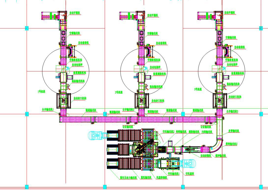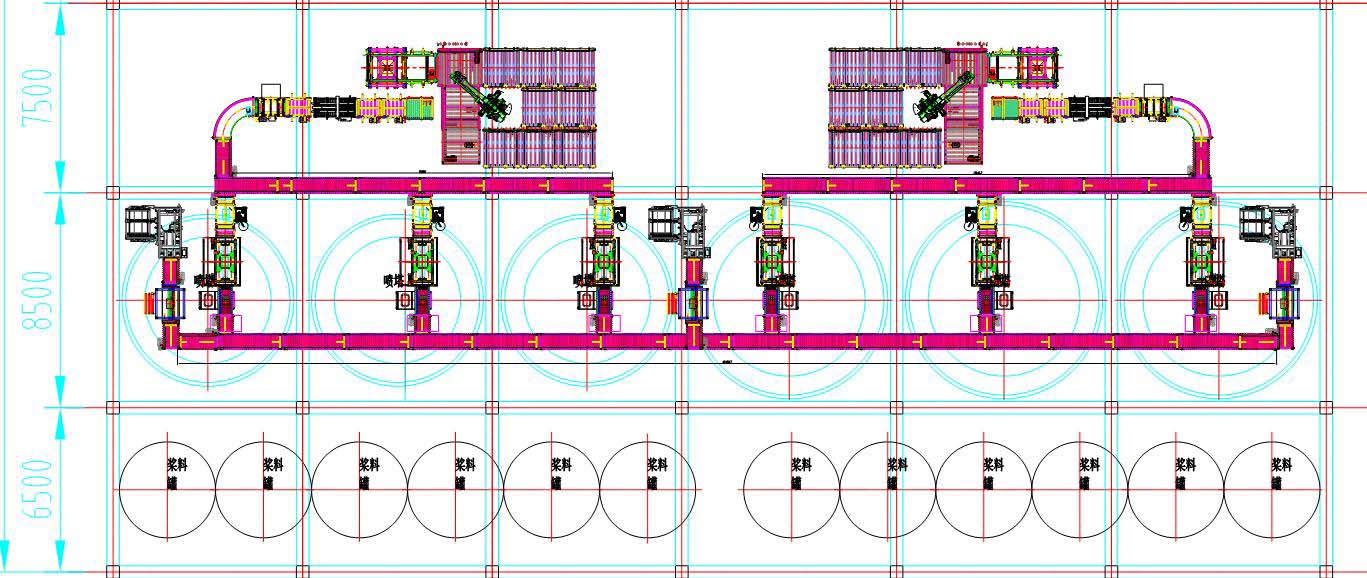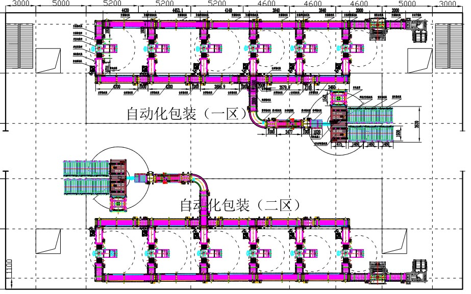 再如一染料生產(chǎn)企業(yè)(如下圖),一包裝車間有12套拼混設(shè)備,混拼后的染料需要現(xiàn)實無人化的生產(chǎn)流程,同時需要考慮到設(shè)備的兼容性以及滿足用戶生產(chǎn)流程,因而設(shè)計成單邊六合一的包裝碼垛生產(chǎn)線。